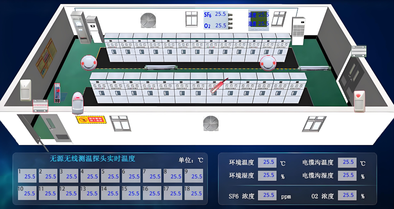 對變壓器、高壓柜、電纜和低壓柜的溫度、局放等設備狀態(tài)信息采集,并結合擴展設備實現電氣設備預警聯動,對配電房設備實時在線監(jiān)控。