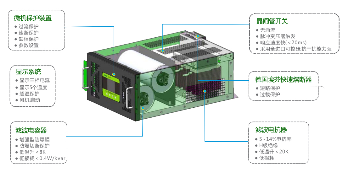 安全可靠:匹配高性能電力電容器和串聯(lián)電抗器,體積小、重量輕、高品質(zhì)、低溫升、低功耗、壽命長,從而保證了整機(jī)的安全性和可靠性。