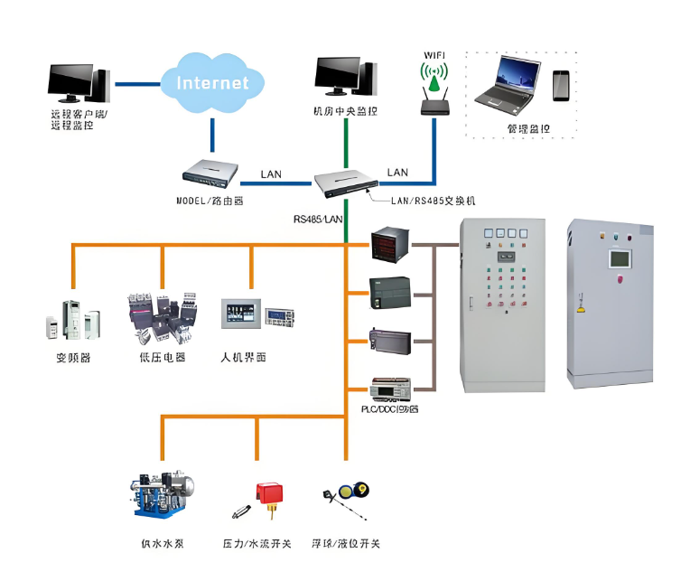 供水設(shè)備是為解決由于壓力不足,無(wú)法到達(dá)用戶用水的高度或流量,而專門(mén)研發(fā)設(shè)計(jì)的新型環(huán)保節(jié)能的專業(yè)設(shè)備。供水設(shè)備可分以下幾種,水箱供水設(shè)備,無(wú)塔供水設(shè)備,消防供水設(shè)備,變頻恒壓供水設(shè)備,通過(guò)該系統(tǒng)可實(shí)現(xiàn)對(duì)水泵的開(kāi)停、主排水管路的流量、水泵排水管的壓力、水倉(cāng)的水位等信號(hào)的實(shí)時(shí)監(jiān)測(cè),并能通過(guò)該系統(tǒng)實(shí)現(xiàn)三臺(tái)主水泵的自動(dòng)、手動(dòng)控制并和PLC監(jiān)控系統(tǒng)的聯(lián)網(wǎng)運(yùn)營(yíng),實(shí)現(xiàn)地面監(jiān)控。